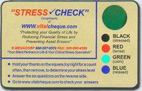 Good news! Our unique STRESS CHECK card let's you monitor your level of stress. In just 10 seconds it indicates your stress level by turning one of four colours - Blue, Green, Red or Black.